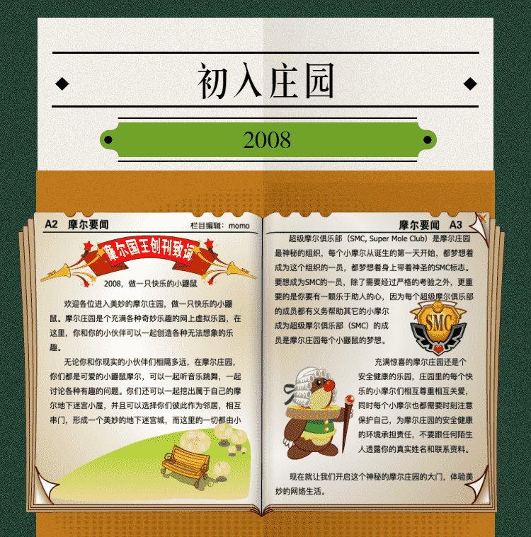 在这一年,,,,摩尔庄园诞生了。。。在这里,,,大家都是可爱的红鼻子鼹鼠小摩尔,,可以一起勤劳耕作,,一起高山滑雪......我们都是摩尔庄园的建设者。。