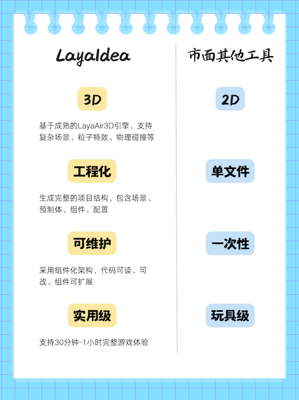 基于LayaAir引擎,,,,LayaIdea构建了一套完整的工业级AIGC开发流程,,实现了从策划文档到完整3D游戏项目的自动化生成,,,与市面现有AIGC工具在技术能力、、、实用性上形成显著差异,,,具体对比如下::